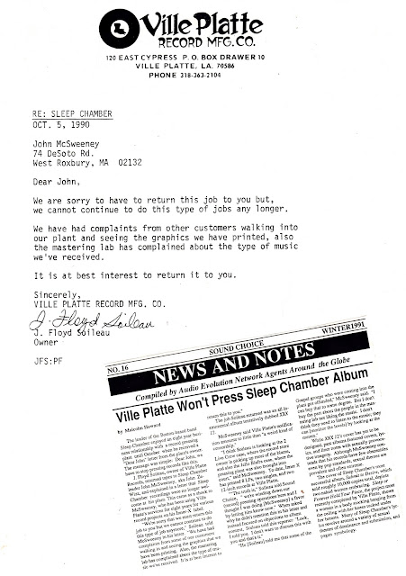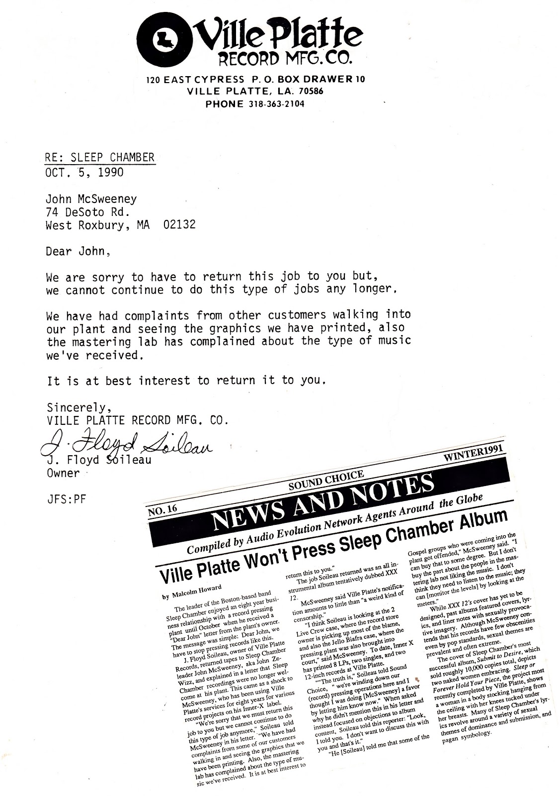 I picked a few girls to play around on the stage while we performed. One girl waz a stripper and the other waz a ballet dancer.....What a ying-yang energy to evoke here. Being wasted seemed to ghost their inhibitions. It waz also messy for my taste. Little did I know this would bring me the concept for THE BARBITCHUETTES. After returning back from the 1990 Tour ov TEXAS other issues were brewing...VILLE PLATTE Record manufacturing announced that they were no longer going to manufacture SLEEP CHAMBER vinyl or any products. A few magazines caught the story and contacted them for a response...and az usual it waz lame. Shown below iz an 'official letter' from VILLE PLATTE in LA that WIKAPEDIA might notice az an OFFICIAL NOTICE and not a self promotion from the Band. There iz also a piece from the Magazine "SOUND CHOICE" where they called the Pressing plant requesting why they would no longer make our vinyl LPs.